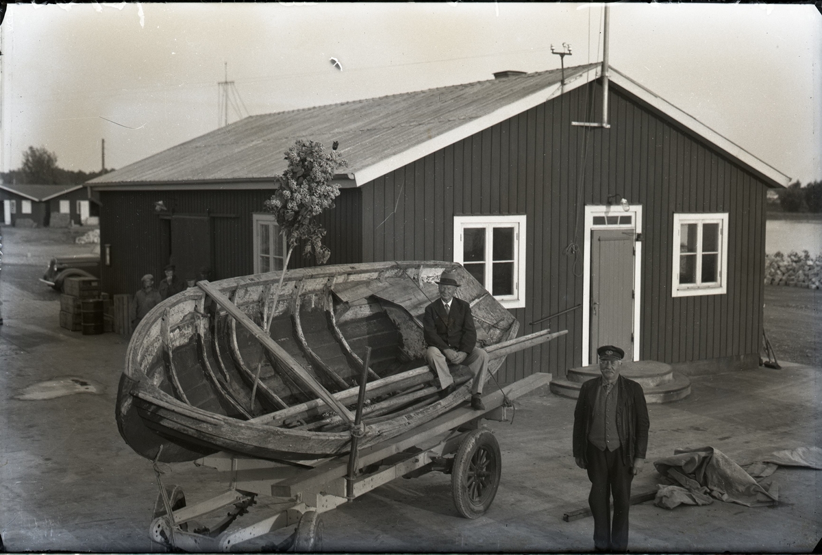 Färjan klar att tagas ombord på Kalmarsund 1 för transport till sjöfartsmuseet i Kalmar. Godsägare Willner i Möllstorp som är donator av färjan följde med på resan. Bilden publicerad i Barometern 2 Juni 1937.