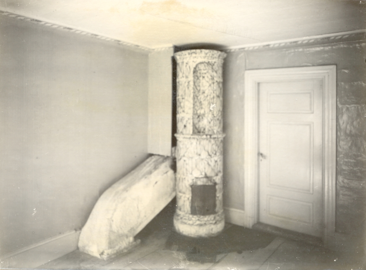 Södra flygeln sydvästra gavelrummet i Ruda herrgård. Ugn av gult gods med violett mönstring, fluten, slingrig rutning och prickning. Järnluckor.