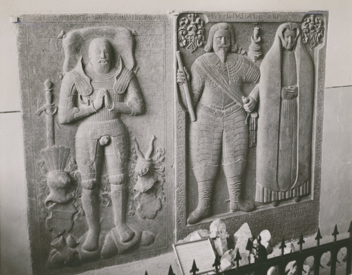 Gravstenar. Till vänster Axel Eriksson Bielke till Nygård död 1559.
