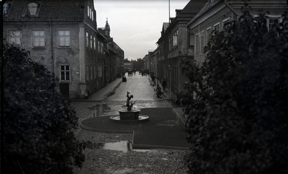 Lilla torget i Kalmar cirka 1935 med skulpturen Sjöjungfrun av Arvid Källström i förgrunden.