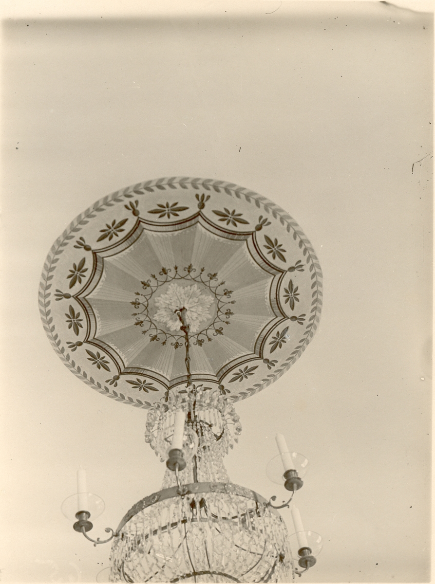 Huvudbyggningen i övre våningen. Takrosett i salongen.
