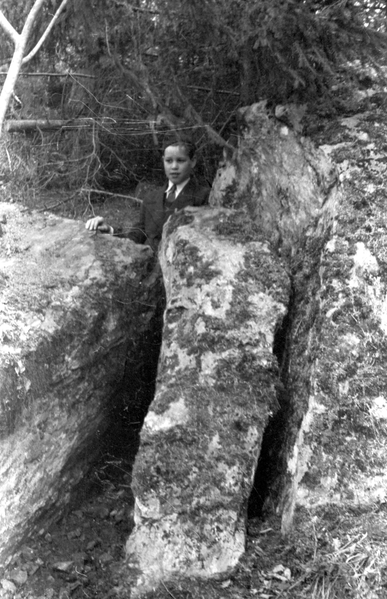 Pojke vid stenblock i Åbyn, Hamrånge, där fynd av glödpannan (GM9699) gjordes på 1940-talet.