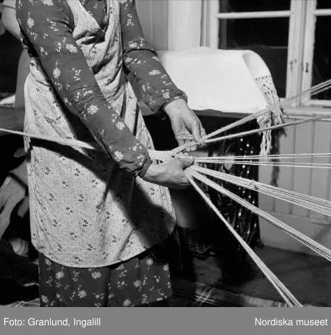 Tillverkning av bögsäcksfässlor, flätning, slingning, i Gruddbo by. Interiör.