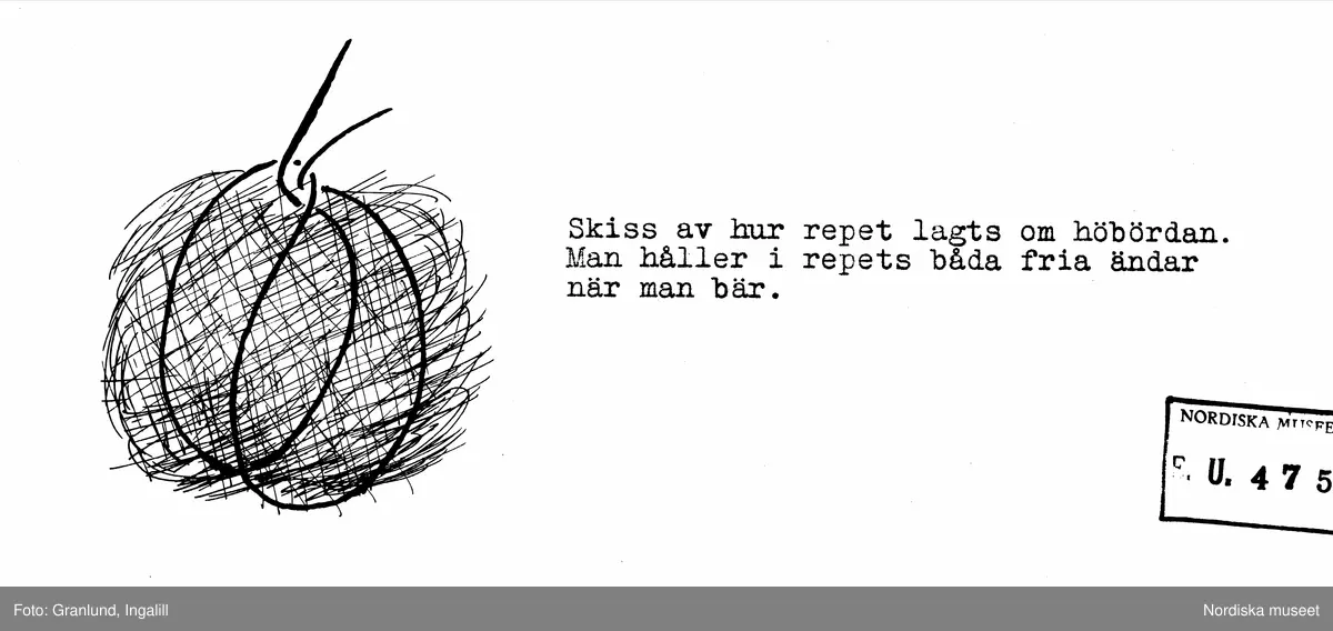 Intagning av hö. Illustration av hur repet lagts om höbördan. EU 47573.