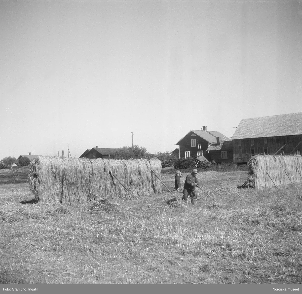 Fräsgården, Osmundsbergs by i Boda socken, Dalarna. Kornet räfsas samman. Säshässjor, kornhässjor, norr om Fräs Erik Hanssons gård. I bakgrunden till höger Larsgården, i mitten Tyskgården och längst till vänster Lomans gård.