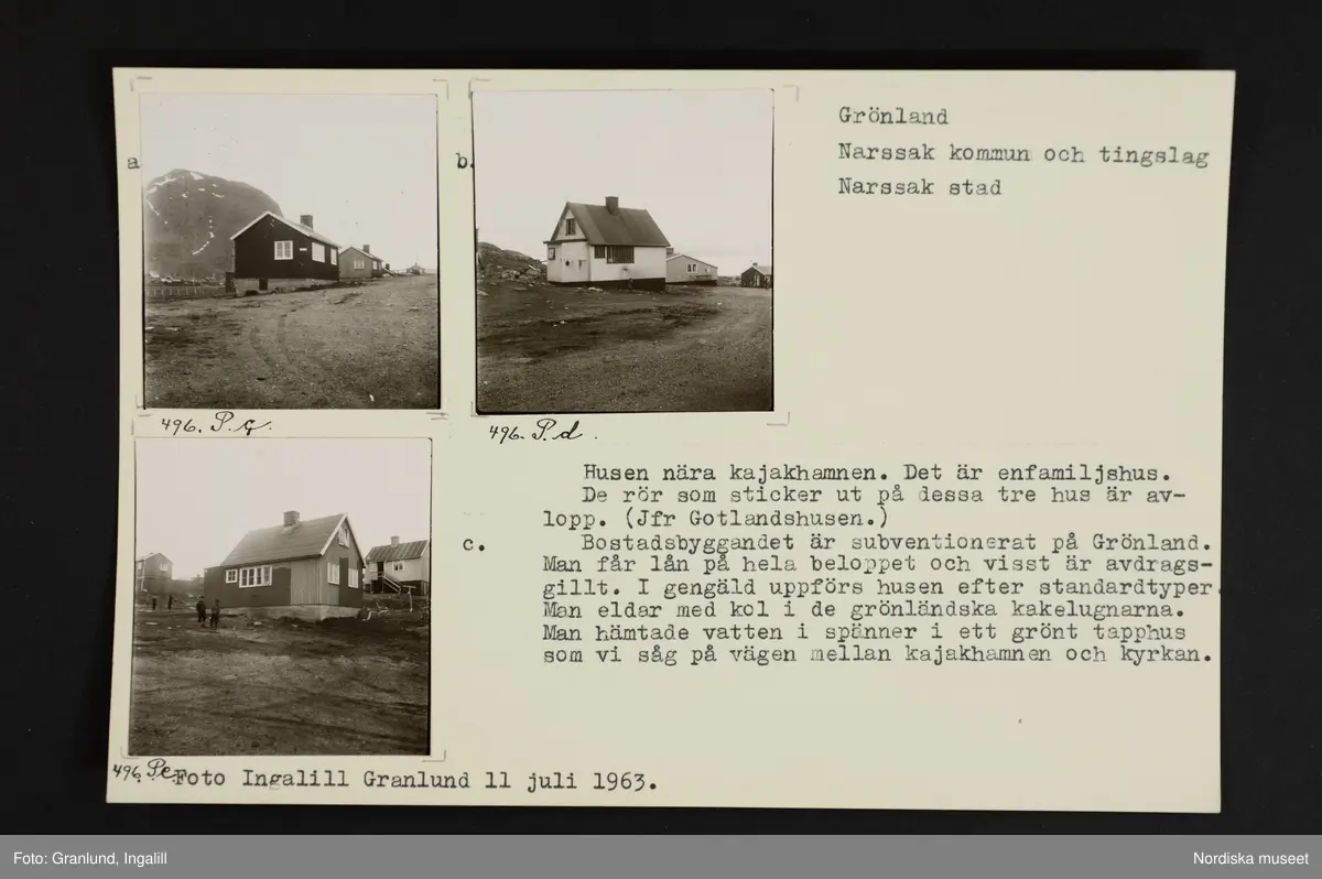 Ark med tre monterade foton och text: "Husen nära kajakhamnen. De är enfamiljshus. De rör som sticker ut på dessa tre hus är avlopp. (Jfr Gotlandshusen.)