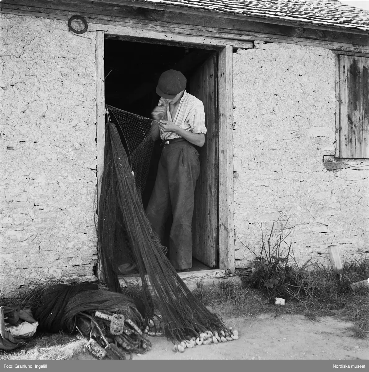 Burs socken, Herta fiskeläge, Gotland. Axel Jakobsson lappar garn stående framför en byggnad.