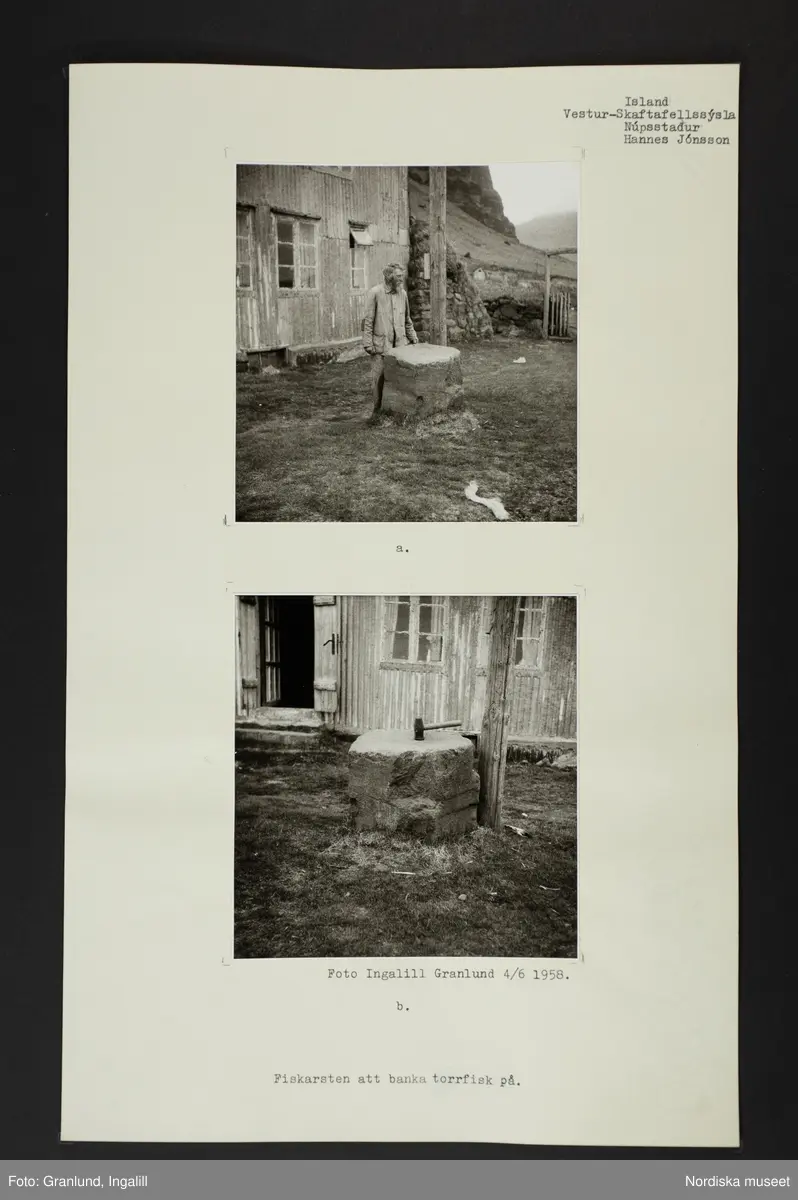 Ark med två monterade foton och text: "Fiskarsten att banka torrfisk på." Mannen på bild anges vara Hannes Jónsson.