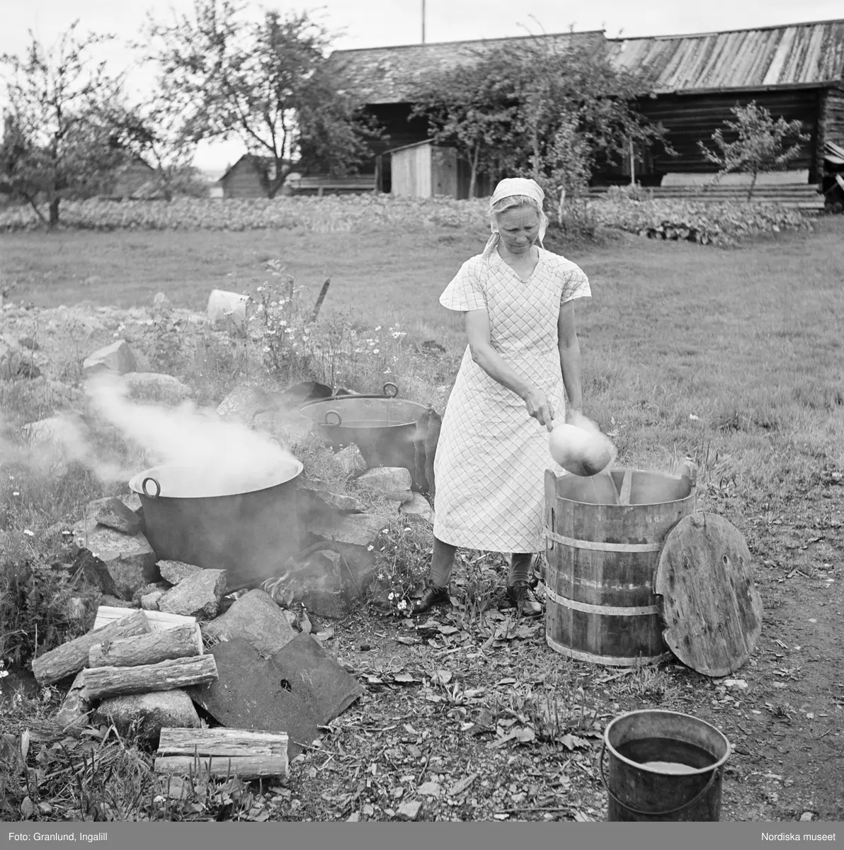Man bryggde ofta på gårdarna, speciellt inför högtider och slåttern. Fanns inget brygghus bryggde man både utomhus och i köket. Kvinna brygger öl vid härd på gården i Gruddbo på Sollerön.