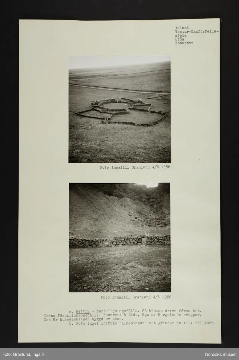 Ark med två monterade foton och text: "a. Rettir = fårskiljningsfålla. På hösten drivs fåren hit. Denna fårskiljningsfålla, Fossrétt à Sidu, ägs av Hörgslands hreppar. Den är huvudsakligen byggd av sten.