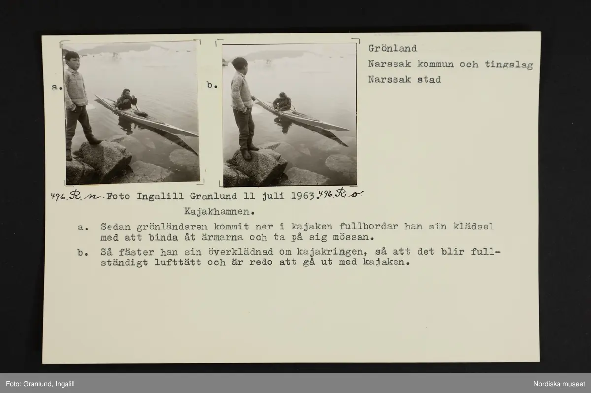 a. Sedan grönländaren kommit ner i kajaken fullbordar han sin klädsel med att binda åt ärmarna och ta på sig mössan.