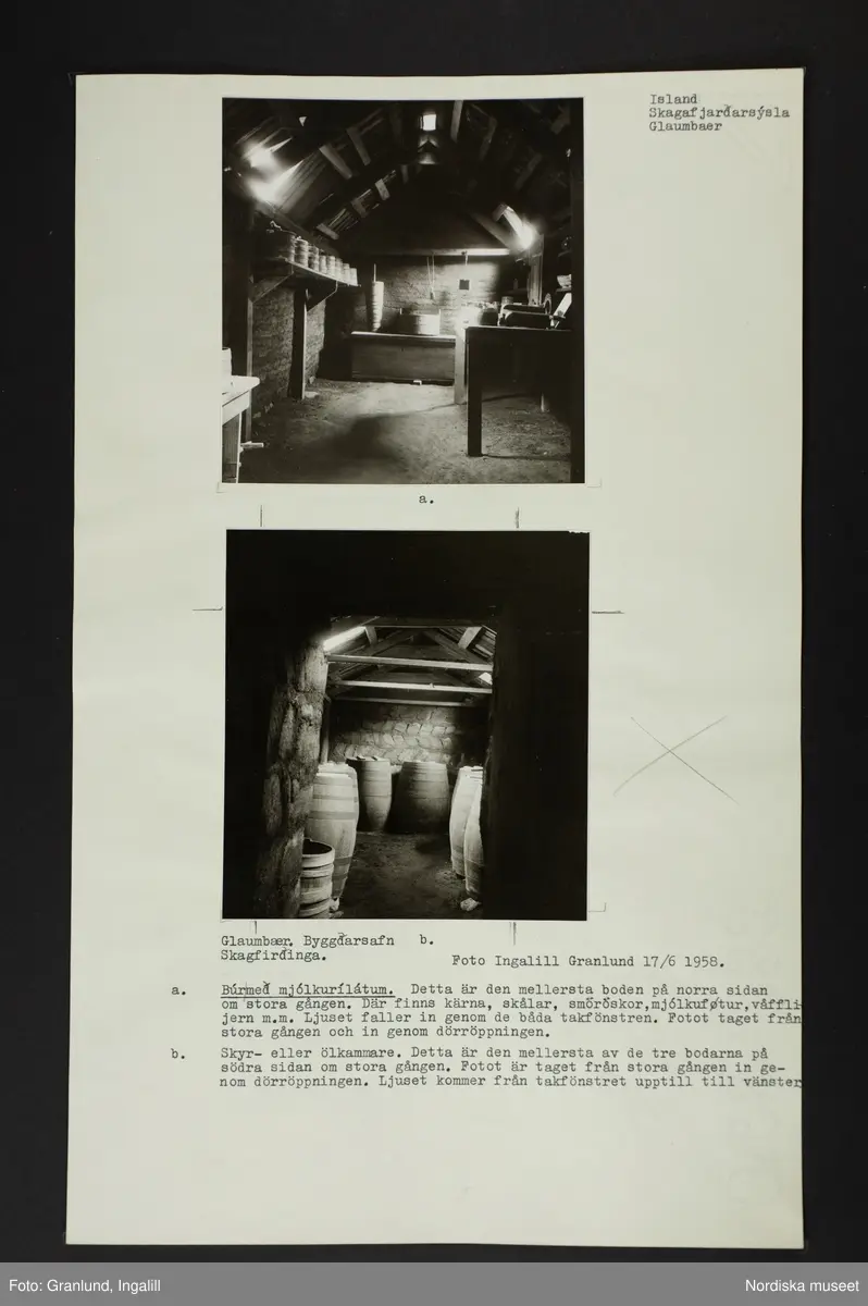 Ark med två monterade foton och text: "a. Búrmed mjólkurílátum. Detta är den mellersta boden på norra sidan om stora gången. där finns kärna, skålar, smöröskor, mjólkufötur, våffli-jern m.m. Ljuset faller in genom de båda takfönstren. Fotot taget från stora gången och in genom dörröppningen.
