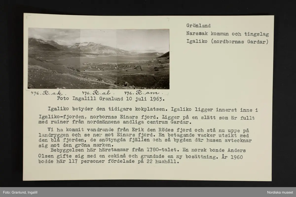 Ark med tre monterade foton och text: "Igaliko betyder den tidigare kokplatsen. Igaliko ligger innerst inne i Igaliko-fjorden, norbornas Einars fjord. Ligger på en slätt som är fullt med ruiner från nordmännens andliga centrum Gardar.