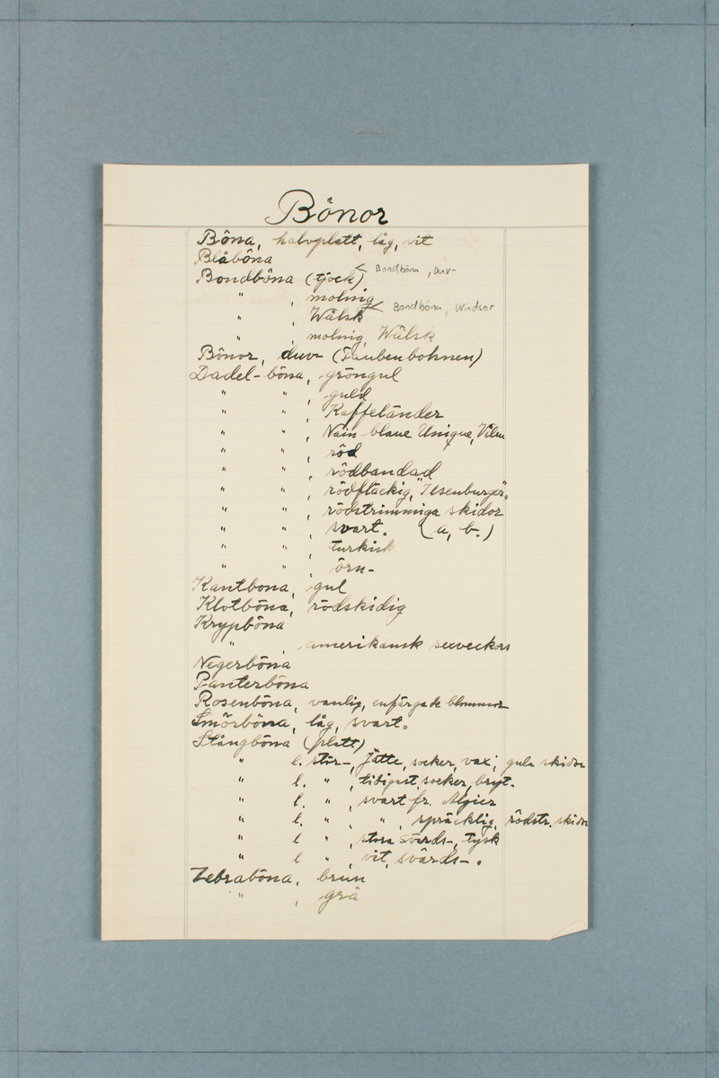 Sveriges kulturväxter. Lista över olika sorters bönor med anknytning till illustrationer utförda av Henriette Sjöberg.