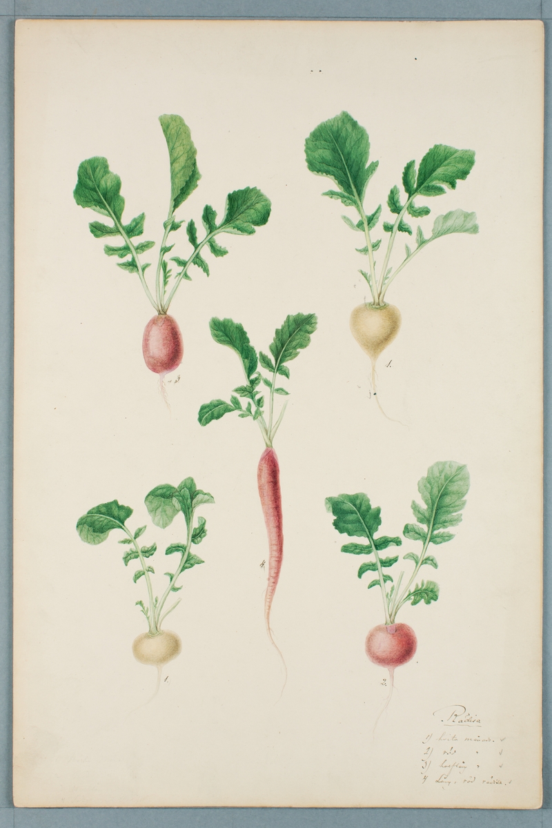 Sveriges kulturväxter. Illustration utförd av Henriette Sjöberg. Rädisor, 1. Vit månads, 2. Röd månads, 3. Halvlång röd månads, 4. Lång röd. Odlingsplats och datering saknas. Inv. nr. C101 : 384. Jämför NMA.0098212.