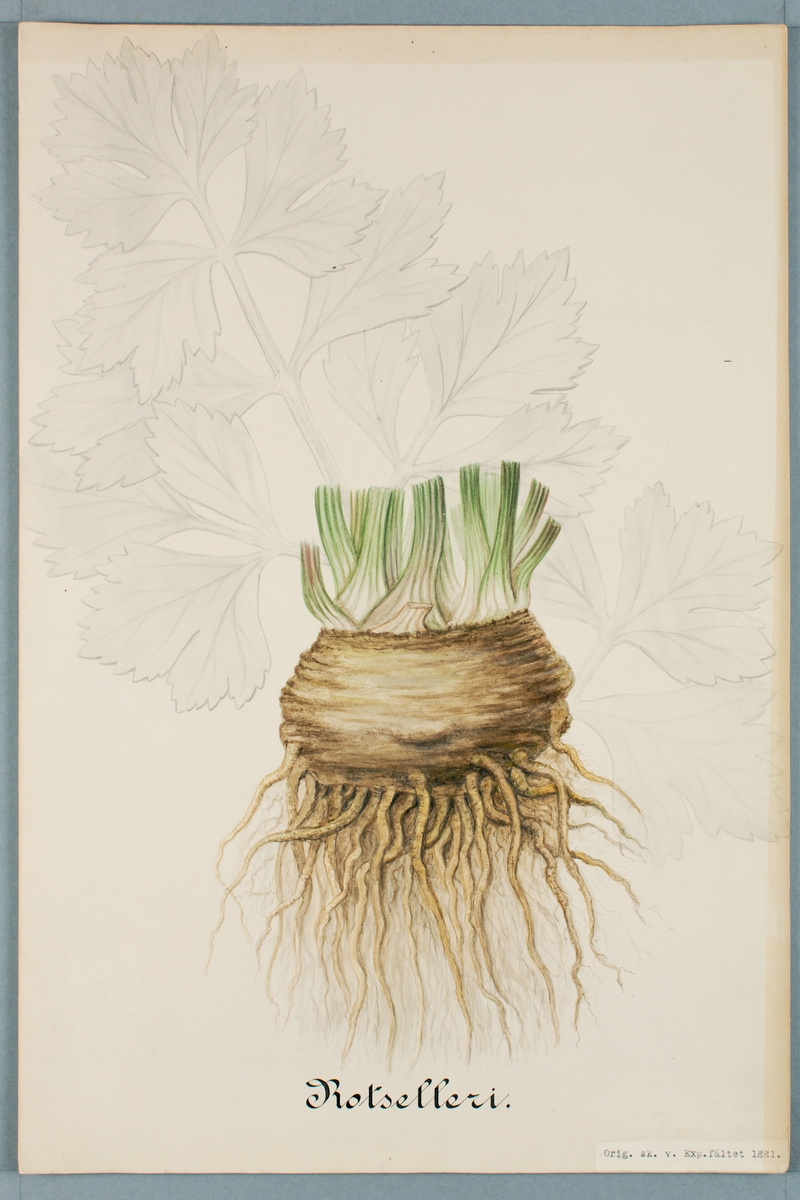 Sveriges kulturväxter. Illustration utförd av Henriette Sjöberg. Rotselleri. Odlad Experimentalfältet 1881. Inv. nr. C101 : 383. Signerad H.S. 81.