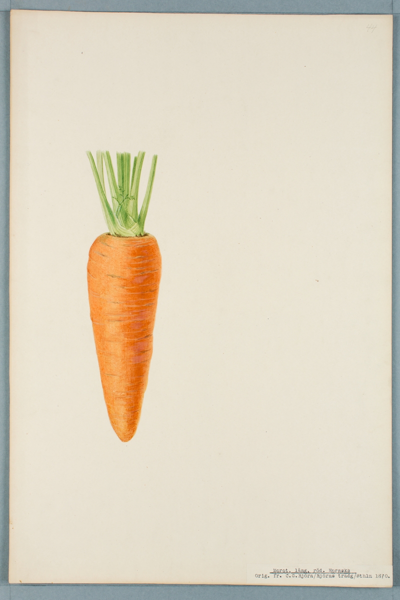 Sveriges kulturväxter. Illustration utförd av Henriette Sjöberg. Morot, halvlång, röd, Hornska. Odlad C. G. Björn, Stockholm 1870. Inv. nr. C101 : 371.