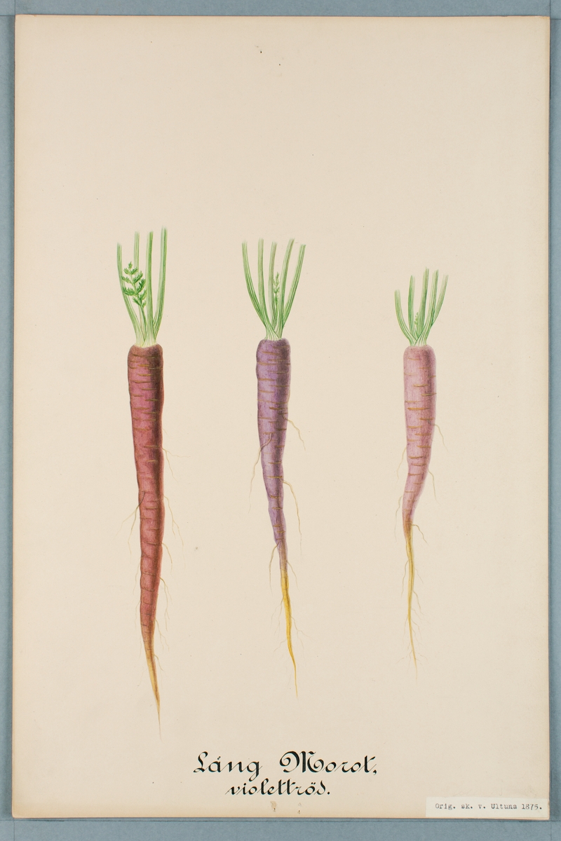 Sveriges kulturväxter. Illustration utförd av Henriette Sjöberg. Morot, lång, violett (tre former). Odlad Ultuna 1875. Inv. nr. C101 : 378.