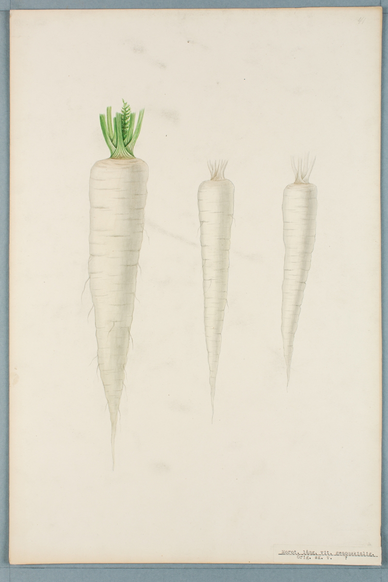 Sveriges kulturväxter. Illustration utförd av Henriette Sjöberg. Morot, lång, vit, genomskinlig. Odlad Ultuna 1874 (1870 enligt Hampus von Posts bok). Inv. nr. C101 : 379.
