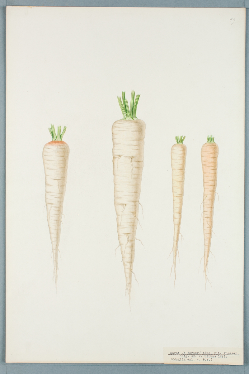 Sveriges kulturväxter. Illustration utförd av Henriette Sjöberg. Morot, lång, vit, Vogeser (tre former). Odlad Ultuna 1871. Inv. nr. C101 : 380.
