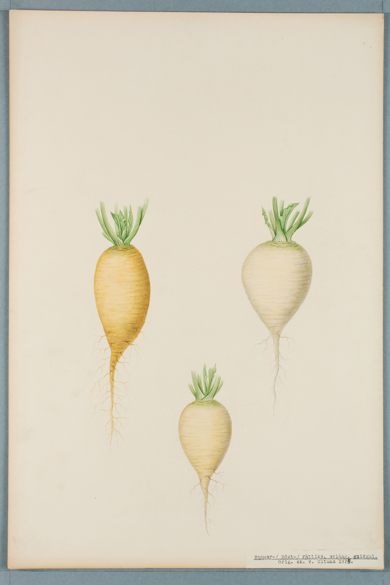Sveriges kulturväxter. Illustration utförd av Henriette Sjöberg. Rättika, avlång, guldgul. Odlad Ultuna1878. Inv. nr. C101 : 388.