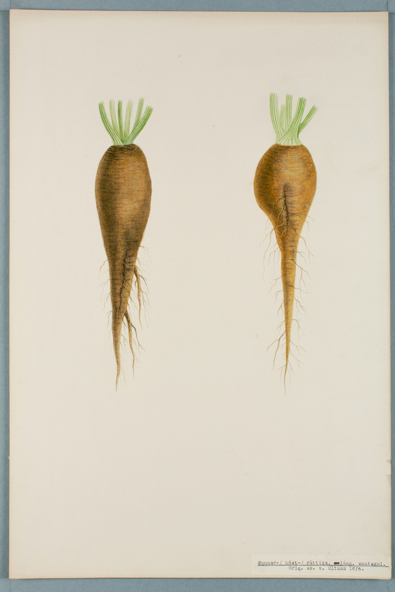 Sveriges kulturväxter. Illustration utförd av Henriette Sjöberg. Rättika, lång, smutsgul. Odlad Ultuna 1876. Inv. nr. C101 : 389.