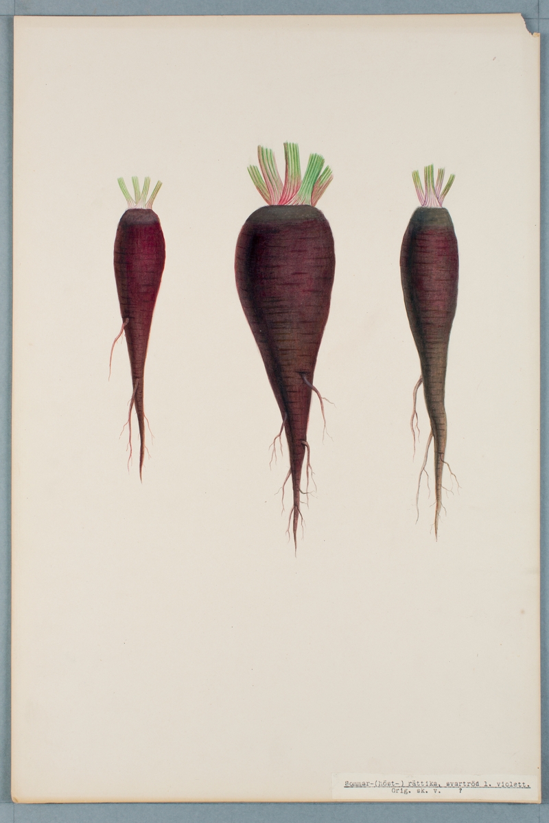 Sveriges kulturväxter. Illustration utförd av Henriette Sjöberg. Rättika, lång, svartröd, violett. Odlingsplats och datering saknas. Möjligen Ultuna. Inv. nr. C101 : 394.