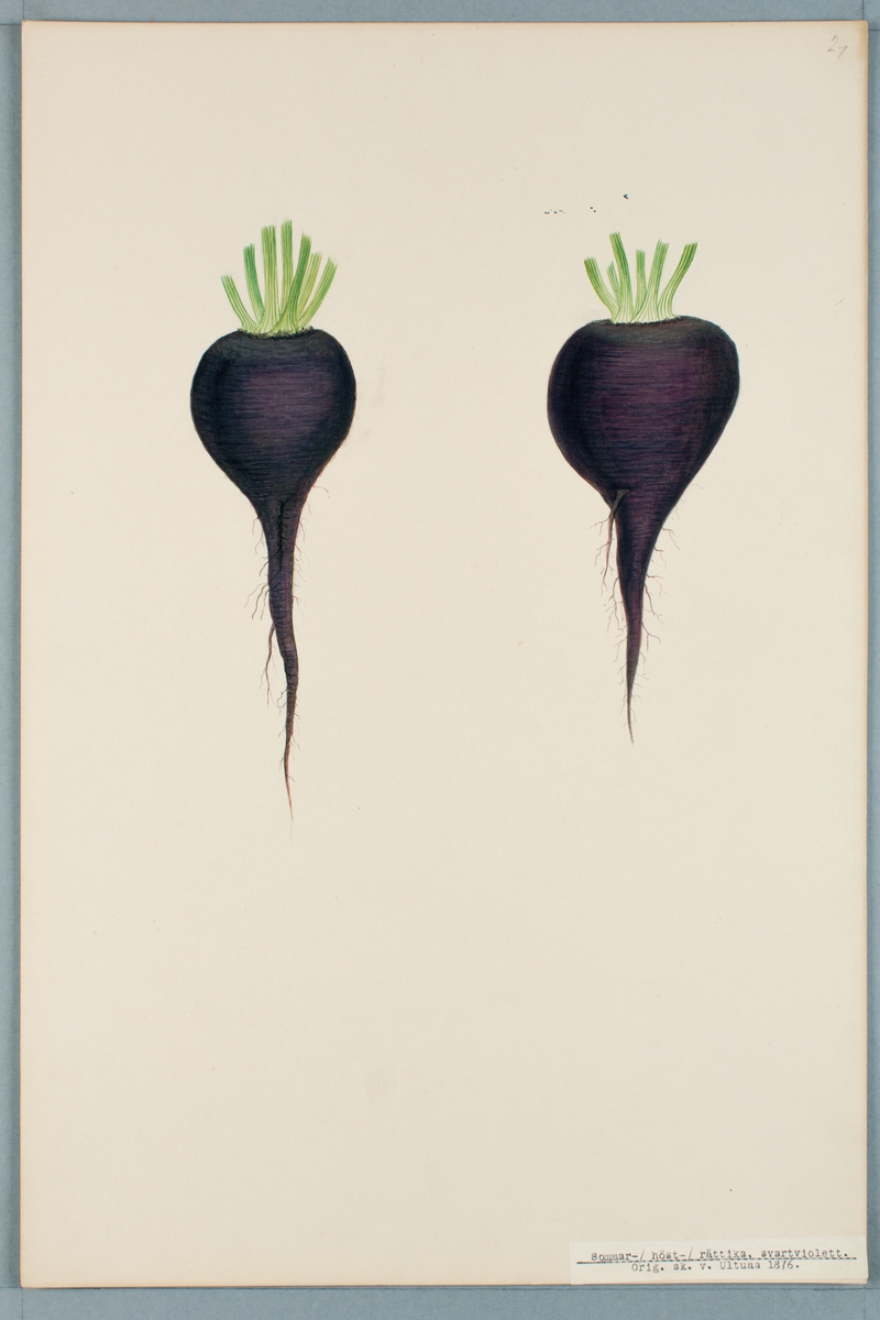 Sveriges kulturväxter. Illustration utförd av Henriette Sjöberg. Rättika, svartviolett, Odlad Ultuna 1876. Inv. nr. C101 : 395.