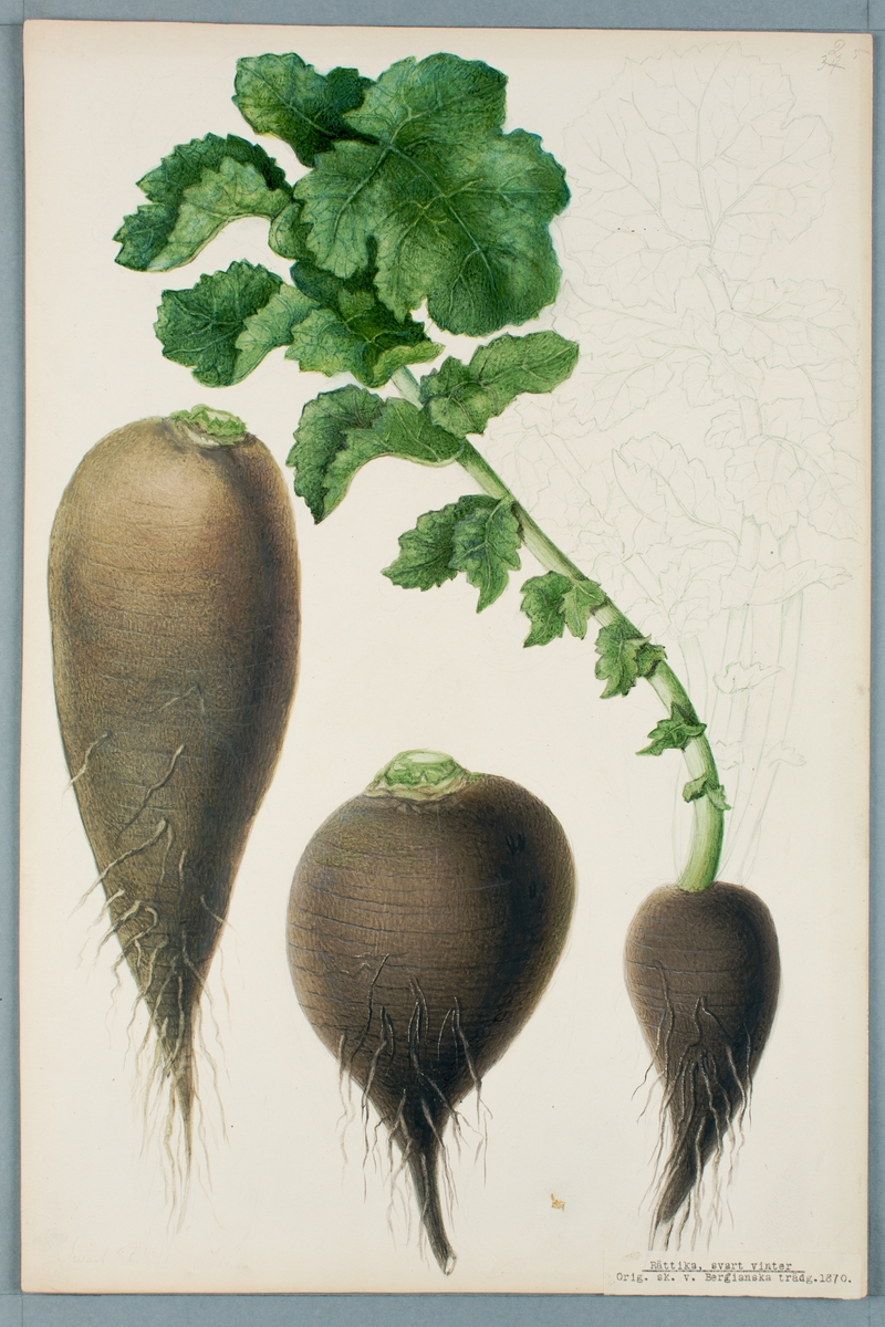 Sveriges kulturväxter. Illustration utförd av Henriette Sjöberg. Rättika (vinterrättika), svart. Odlad Bergianska trädgården 1870. Inv. nr. C101 : 401.