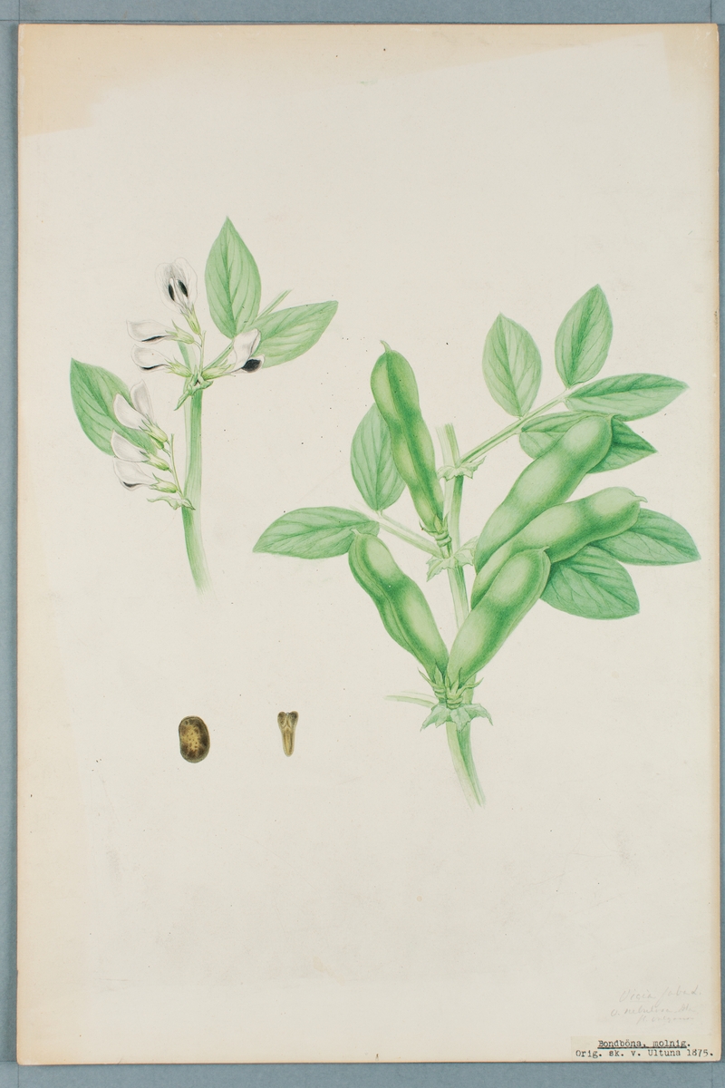Sveriges kulturväxter. Illustration utförd av Henriette Sjöberg. Bondböna, molnig. Odlad Ultuna 1875. Inv. nr. C101 : 443.