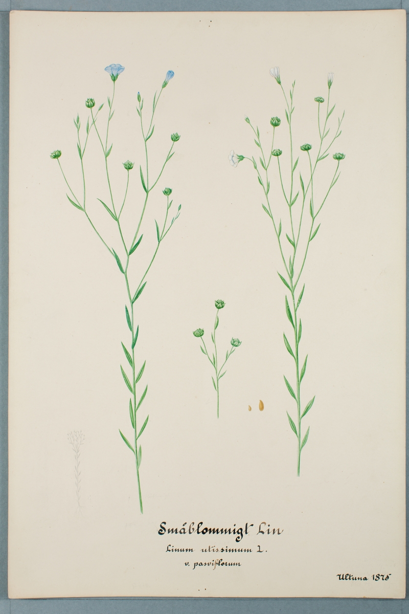 Sveriges kulturväxter. Illustration utförd av Henriette Sjöberg. Småblommigt lin. Odlat Ultuna 1875.