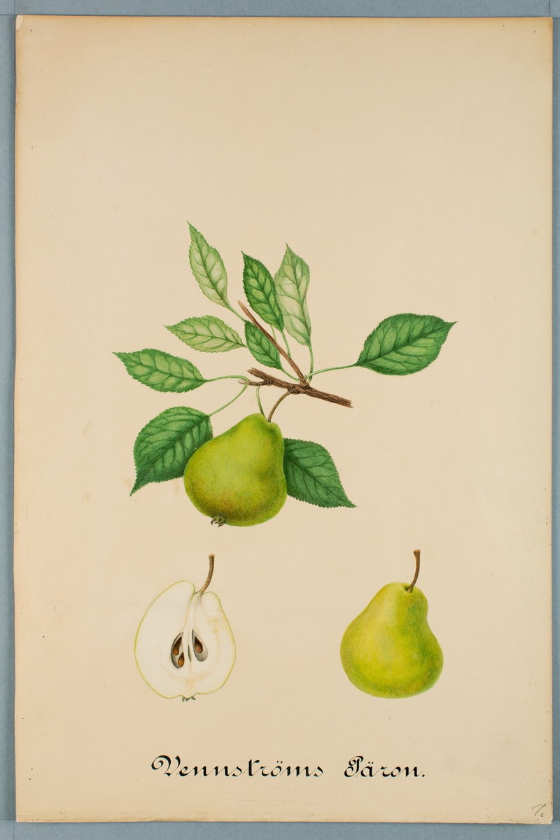 Sveriges kulturväxter. Illustration utförd av Henriette Sjöberg. Päron, Vennströms päron. Odlingsplats saknas, 1884. Signerad H.S. 1884.