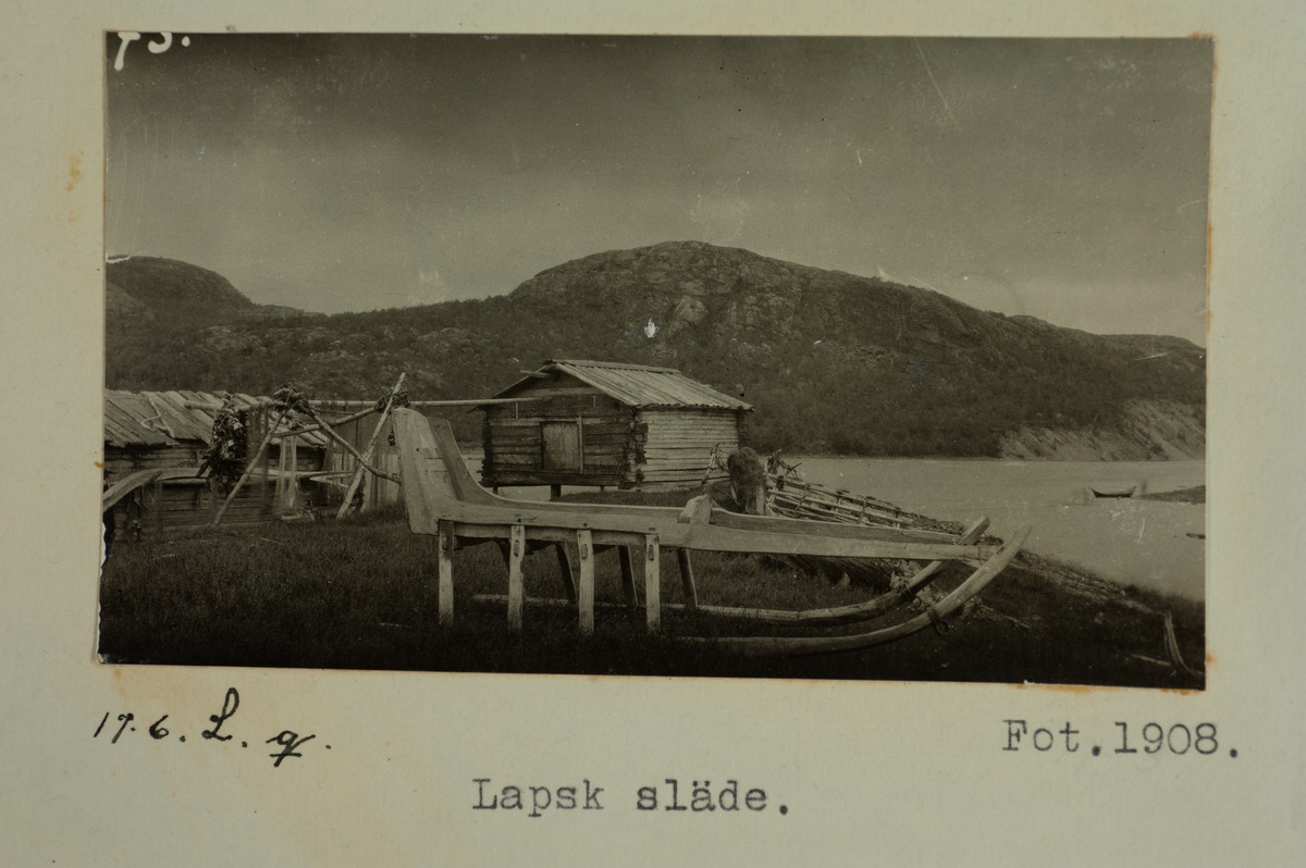 Ark med monterat foto och text: "Lapsk släde. Fot. 1908."