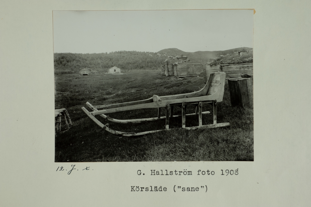 Ark med monterat foto och text: "Körsläde ("sane"). G. Hallström foto 1908."