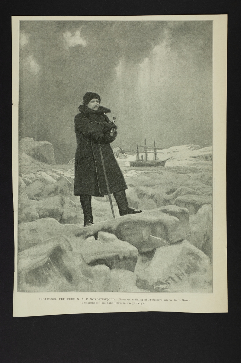 Tryckt bild och text: "Professor, Friherre N. A. E. Nordenskjöld. Efter en målning av professorn Greve G. v. Rosen. I bakgrunden ses hans infrusna skepp Vega".