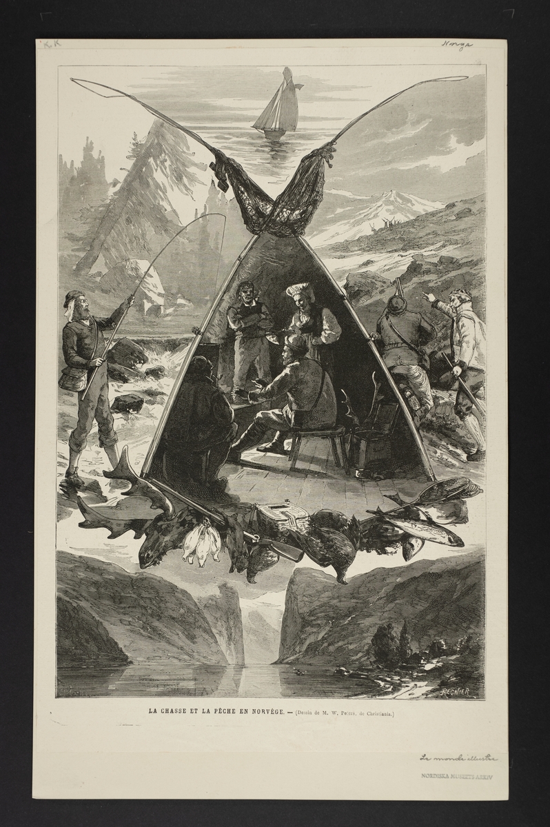 Ark med monterat bildtryck och text: "La Chasse et la Péche en Norvège. - (Dessin de M. W. Peters, de Christiania.)"