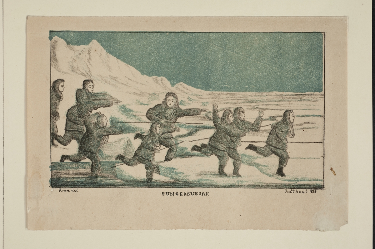 Ark med monterat bildtryck och text: "Sungersussak". Efter akvarell av Aron från Kangeq, daterad Godthaab 1860.