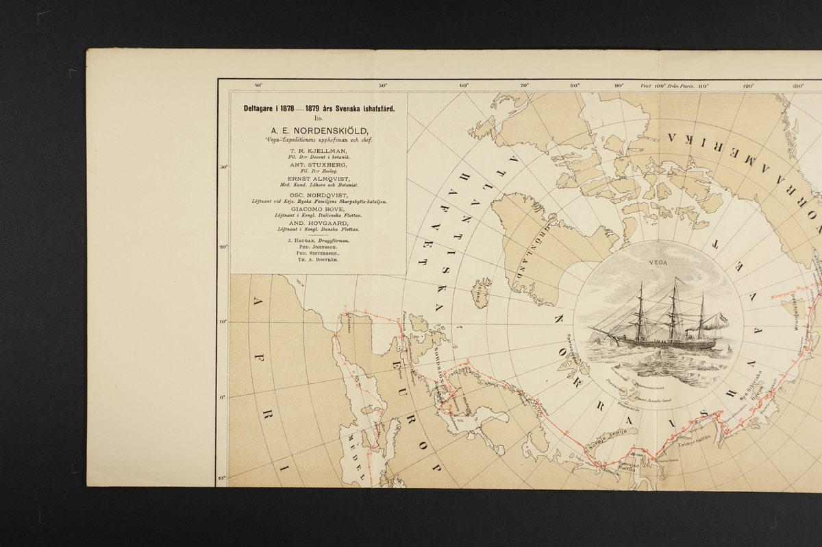 Karta: "Vega's kurslinje på Nordost-Passagen och hennes väg rundtomkring Asien och Europa under befäl af Louis Palander. Deltagare i 1878-1879 års Svenska ishafsfärd."