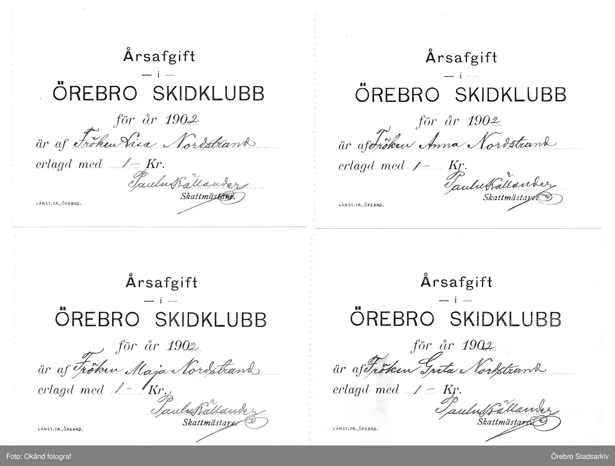Medlemskort för systrarna Nordstrand i Örebro skidklubb, 1902
