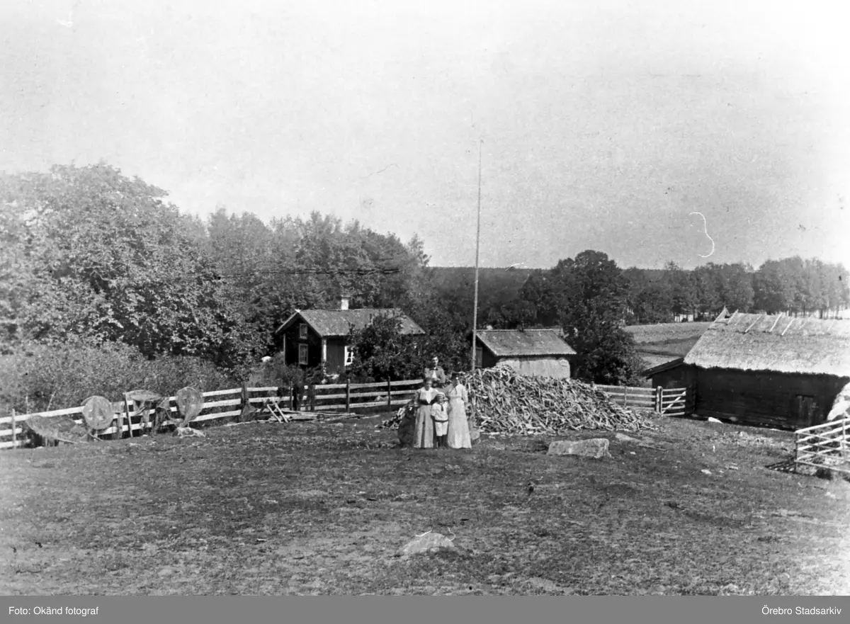 Familj vid vedhög i Stora Mellösa, ca 1900