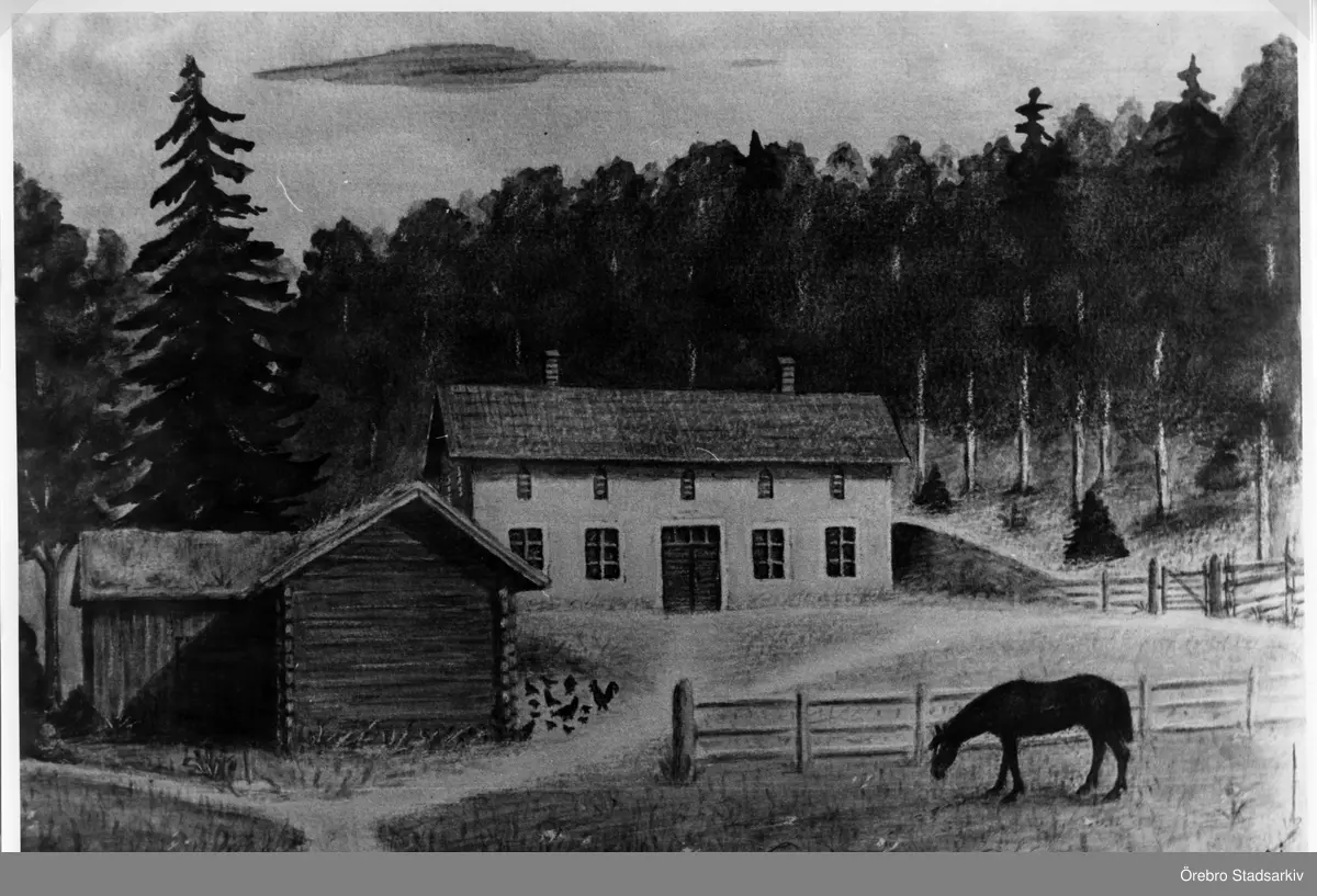 Teckning av äldre byggnad på Israel-Persagården i Skrekarhyttan, 1923 ca