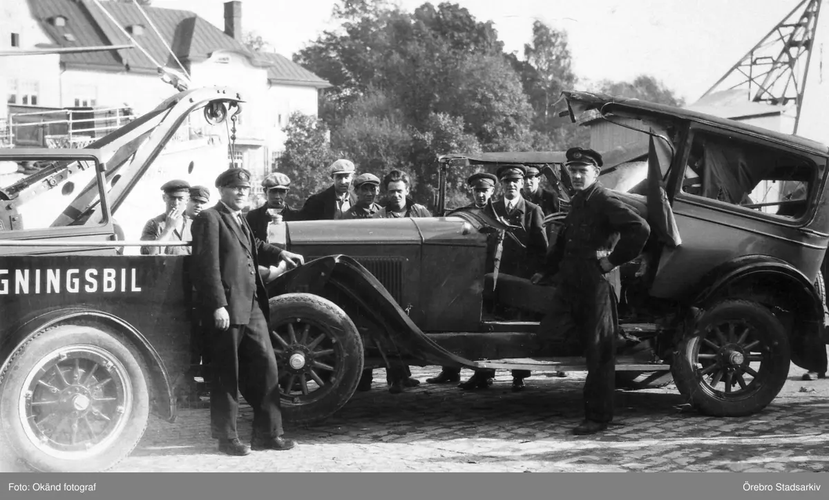 Bärgningsbil hämtar krockskadad bil på Hamnplan, 1920-tal