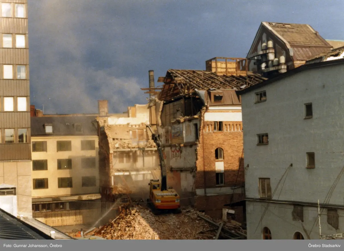 Grävmaskin i rivningsmassa vid Gamla Kvarnen, 1981