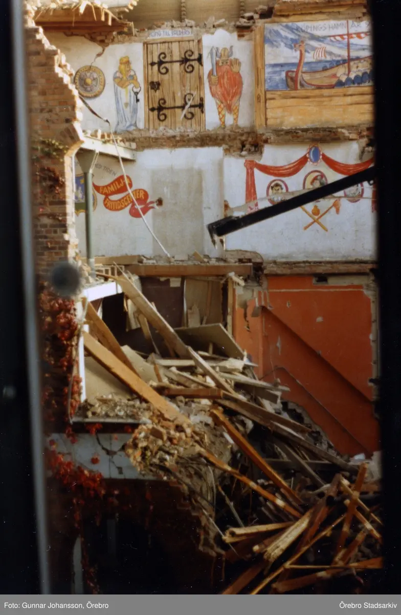 Vid rivning av Gamla Kvarnen syns väggmålning i hörnet, 1981