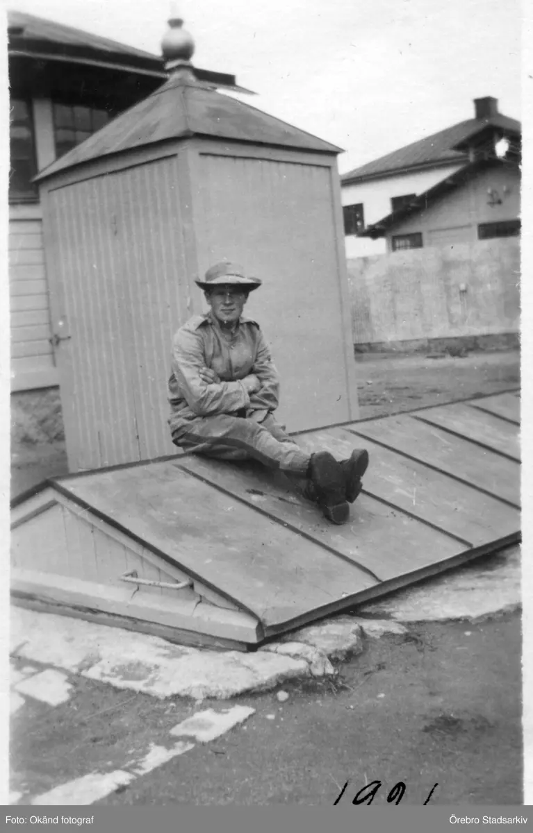 Värnpliktig på tak på Svea Trängkår på Älvtomtagatan, 1926