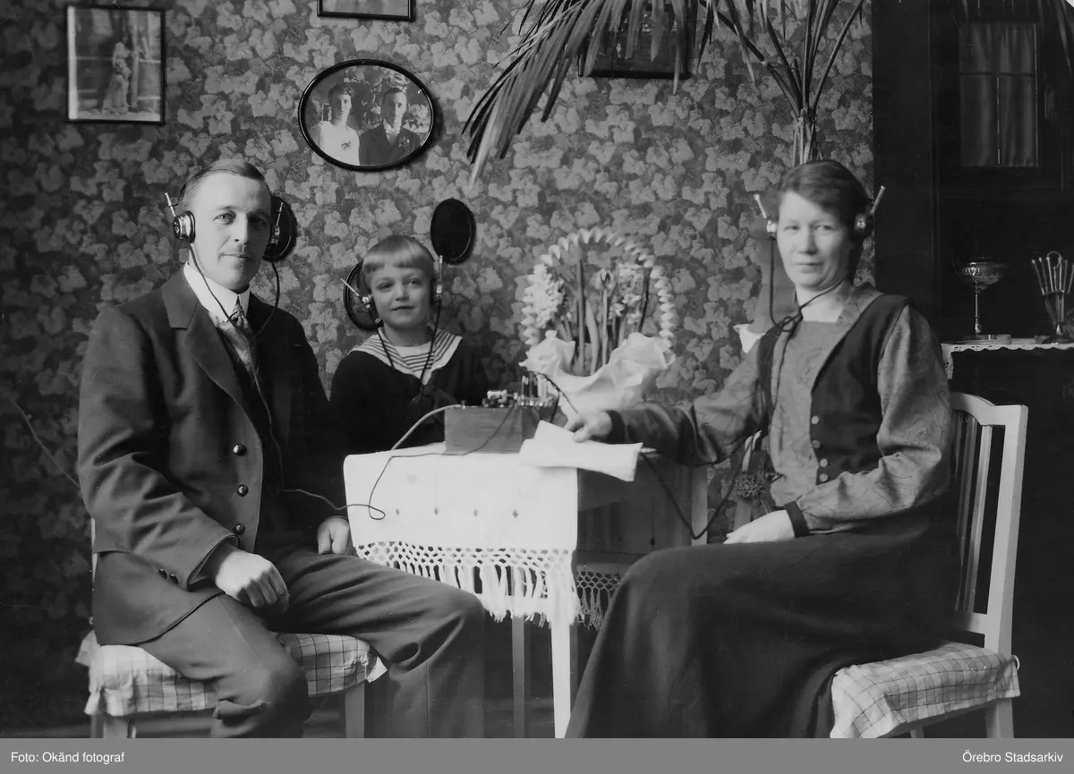Familj lyssnar på radio med kristallmottagare, 1920-tal
