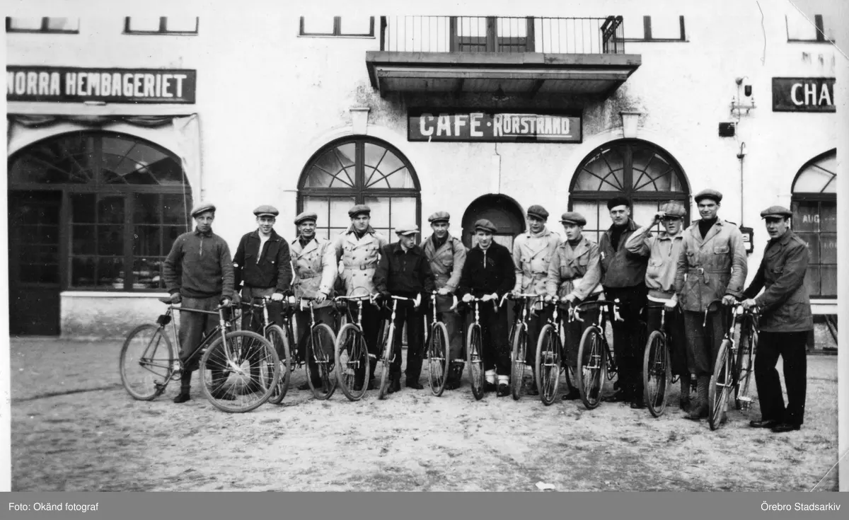 Medlemmar i Örebro Velocipedklubb utanför Café Rörstrand på Hovstavägen, 1930-tal