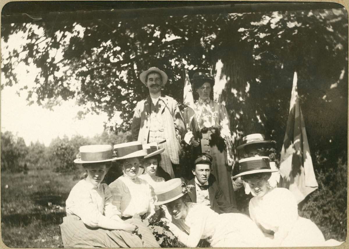 Gruppbild. Kvinnorna som sitter ner bär så kallade kvarnhjulshattar