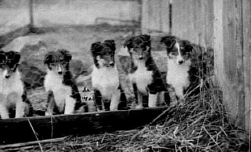 Fem collievalpar i en hundgård.