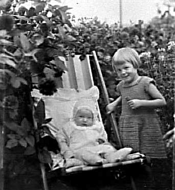 TVÅ SMÅ FLICKOR VARAV DEN ENA SITTER I EN SOLSTOL OCH EN ANDRA STÅR BREDVID